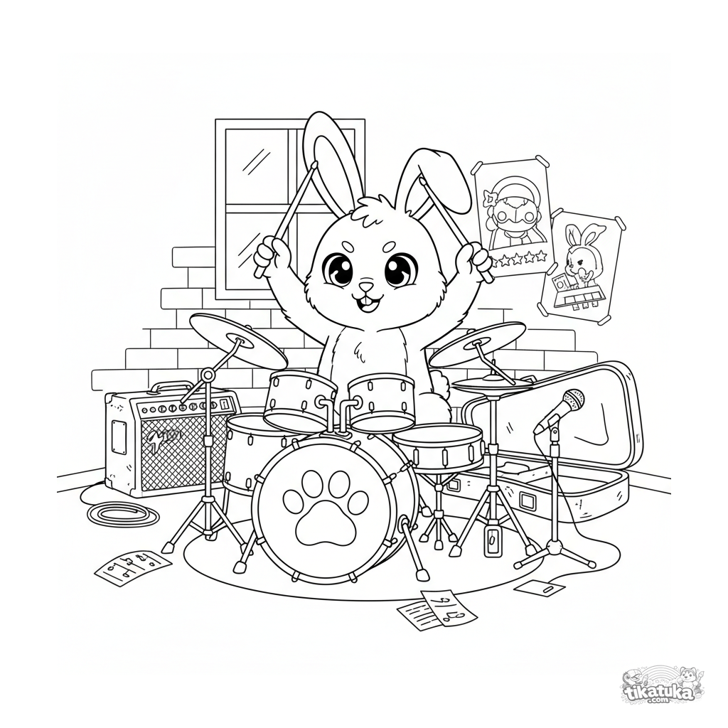 Раскраска для детей: зайчик-барабанщик репетирует в гараже. Весёлая сцена с барабанной установкой и музыкальными инструментами. Для печати и раскрашивания.