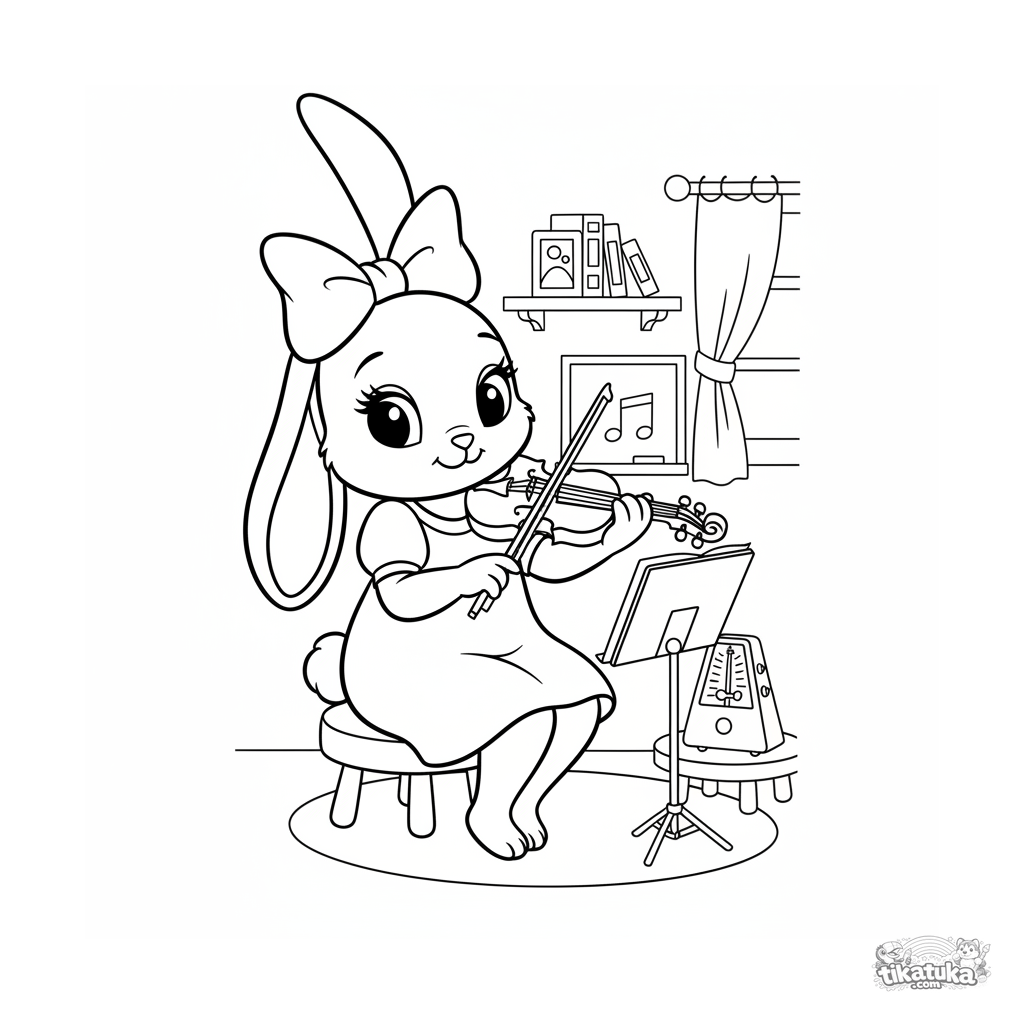 Раскраска для детей 7-9 лет: кролик-учительница музыки настраивает скрипку в школьном классе. Плавные линии в стиле Диснея.