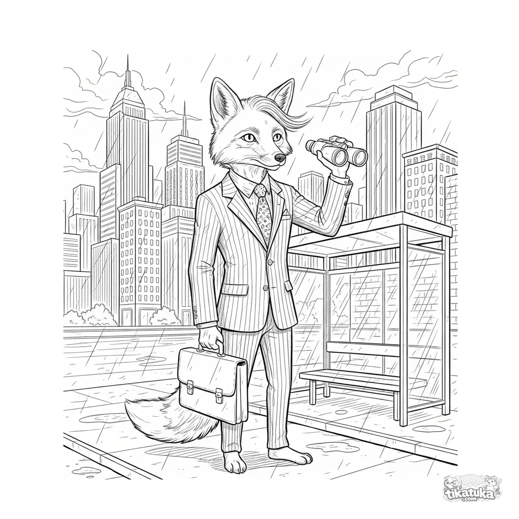 Раскраска для детей 10-12 лет: лис в деловом костюме с портфелем и биноклем на остановке в дождь, смотрит в сторону банков. Сцена в стиле городского скетча.