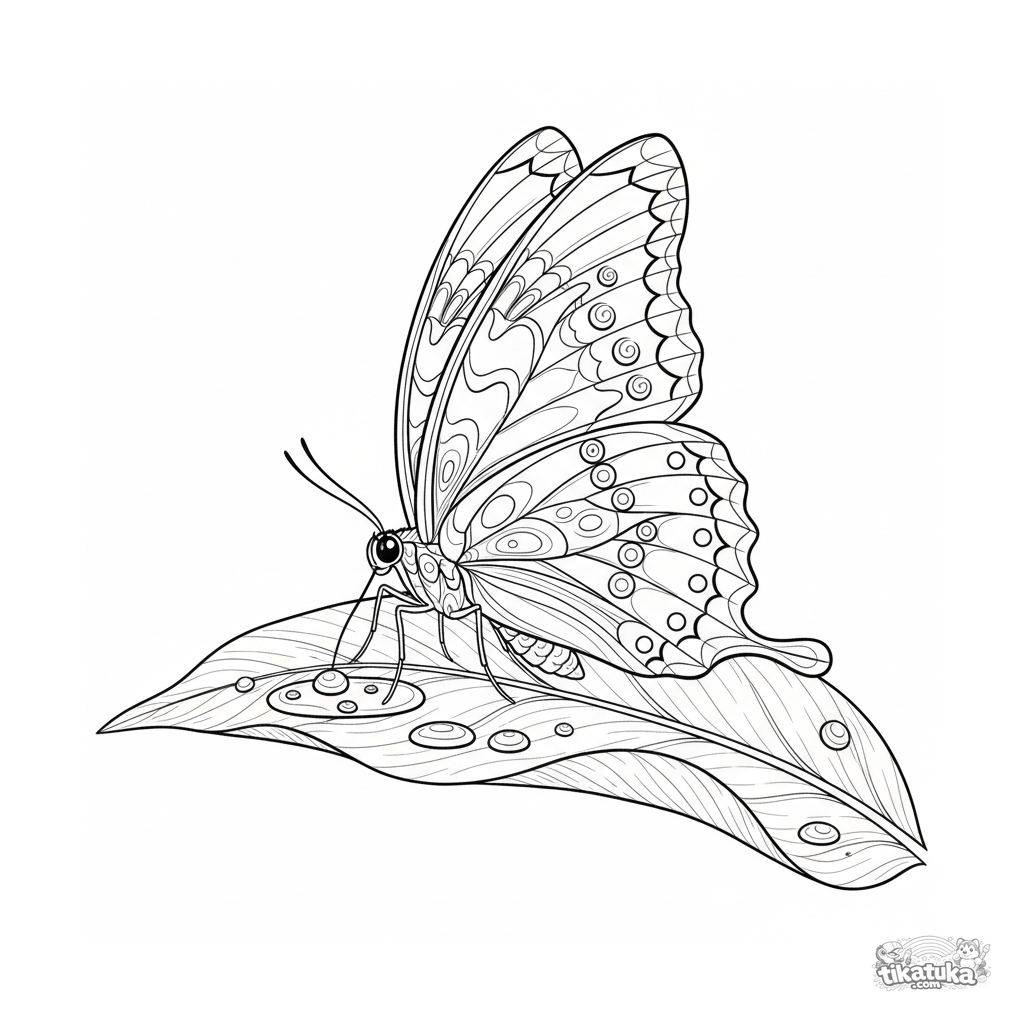 Раскраска для детей 7-9 лет: бабочка с узорчатыми крыльями пьёт воду из скопления росы на листе. Детализированное и реалистичное изображение насекомого.