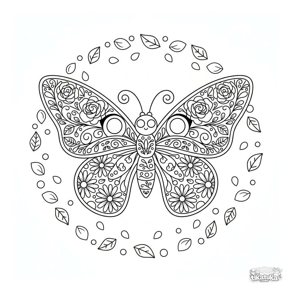 Красочная мандала-раскраска в форме бабочки для детей 10-12 лет. Крылья заполнены розетками, ромашками и виноградными лозами, зеркальная симметрия, плавающие лепестки.