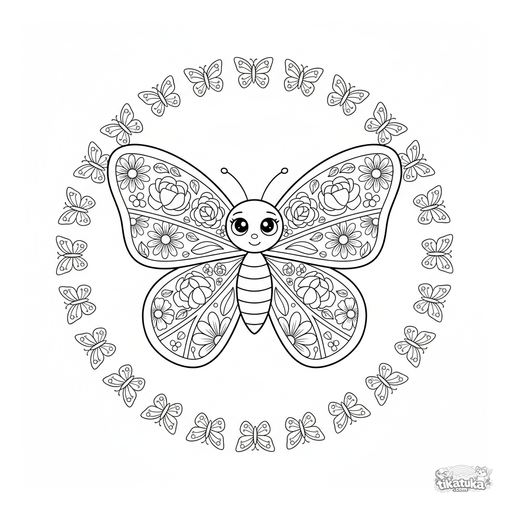 Детальная мандала в форме бабочки для раскрашивания детям 10-12 лет. Крылья бабочки заполнены разными цветочными узорами, окружены кольцом из листьев и мелких бабочек.