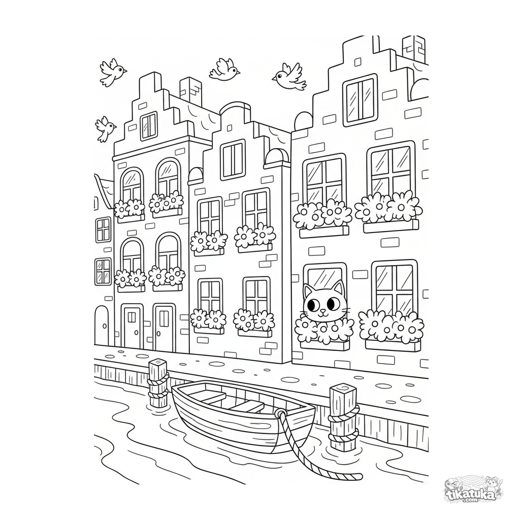 Раскраска для детей: уютный канальный квартал с узкими домами, лодкой и котом на подоконнике. Яркая городская сцена в стиле деревянной игрушки.
