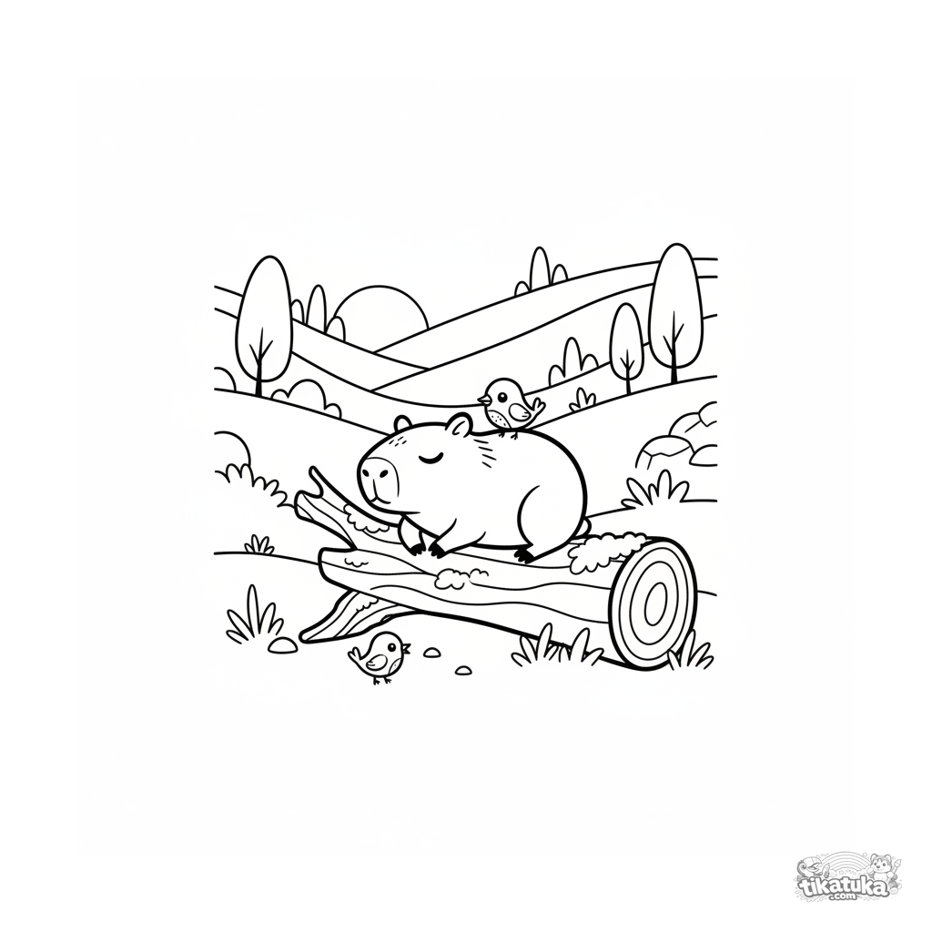 Раскраска капибары, отдыхающей на бревне с птицами на закате. Сцена дружбы и спокойного созерцания для детей 7-9 лет. Широкие чистые поля.