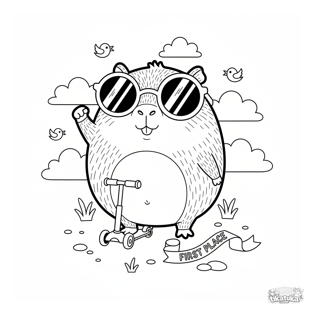 Раскраска для детей 7-12 лет: уверенная в себе капибара в очках празднует победу рядом с крошечным самокатом. Абсурдная и смешная сцена в стиле интернет-юмора.