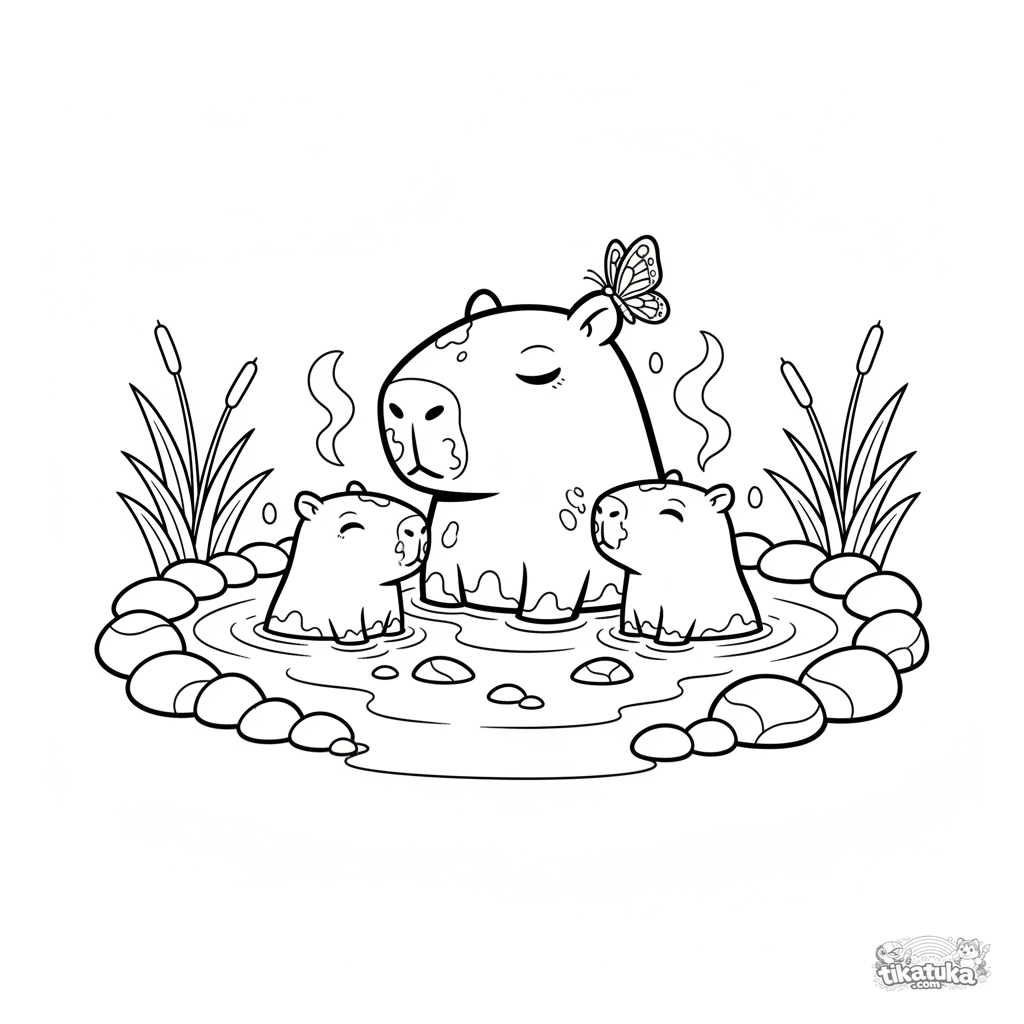 Раскраска для детей 4-6 лет: умиротворяющая сцена, где семья капибар нежится в тёплой грязевой ванне среди камышей. Идеально для расслабленного раскрашивания.