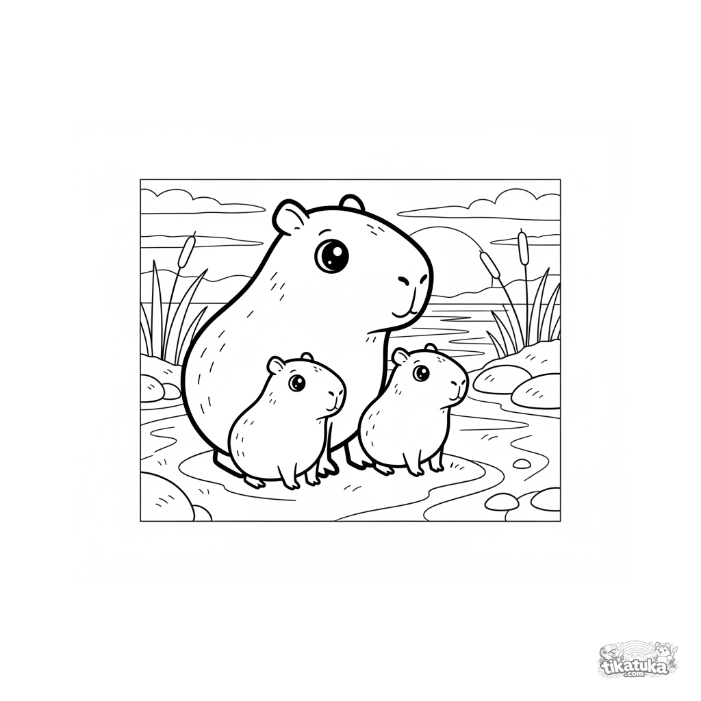 Раскраска для детей 4-6 лет: семья капибар наблюдает за закатом у реки. Мягкие, уютные формы в стиле плюшевой куклы, понятные детали.