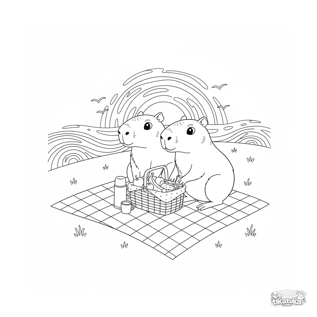Детальная реалистичная раскраска: два капибары-друга на пикнике наблюдают закат. Сцена дружбы и умиротворения для детей 10-12 лет.