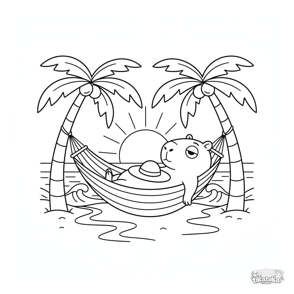 Весёлая раскраска для детей 4-6 лет: капибара отдыхает в гамаке на пляже на закате. Яркие, простые формы в ретро-стиле 90-х.