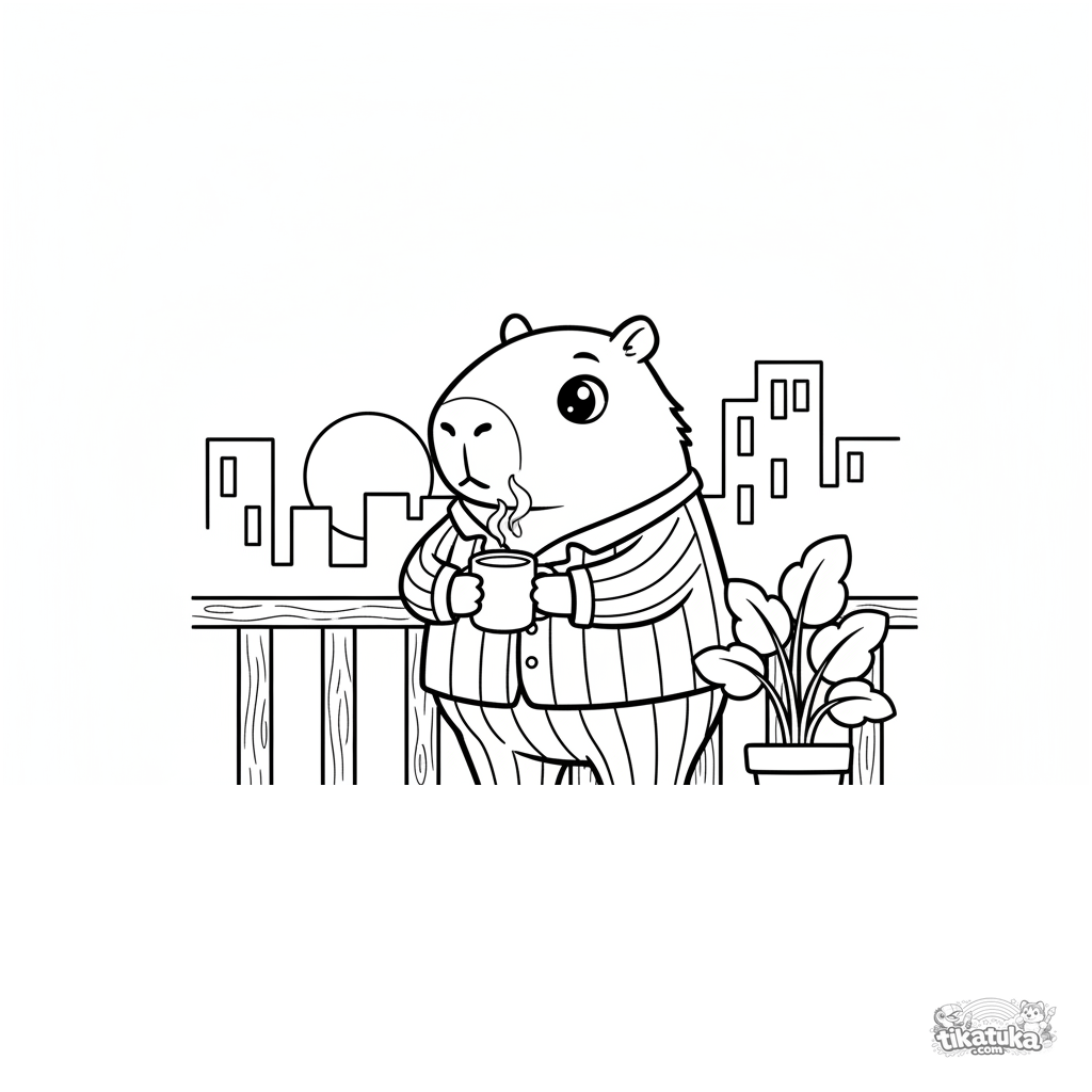 Раскраска для детей 7-9 лет: уютная капибара в пижаме с кружкой на балконе наблюдает за городским закатом. Сцена спокойного вечера и отдыха.