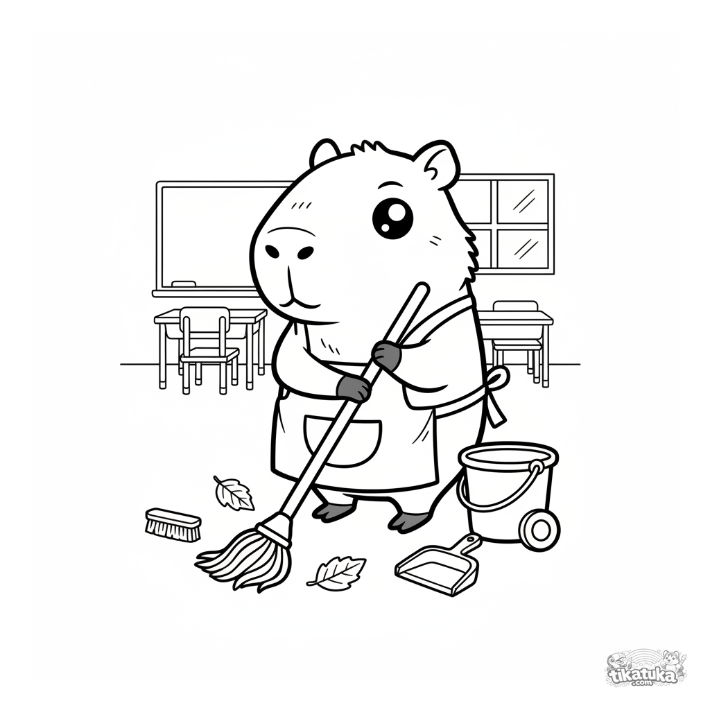 Раскраска для детей 4-6 лет: капибара-уборщик с шваброй в школьном классе. Милая и спокойная сцена для раскрашивания.
