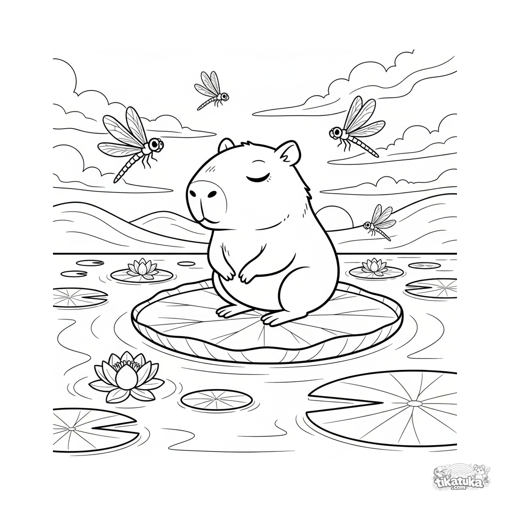 Раскраска для детей 4-6 лет: спокойный капибара медитирует на большой кувшинке в пруду на закате. Сцена о гармонии и умиротворении.