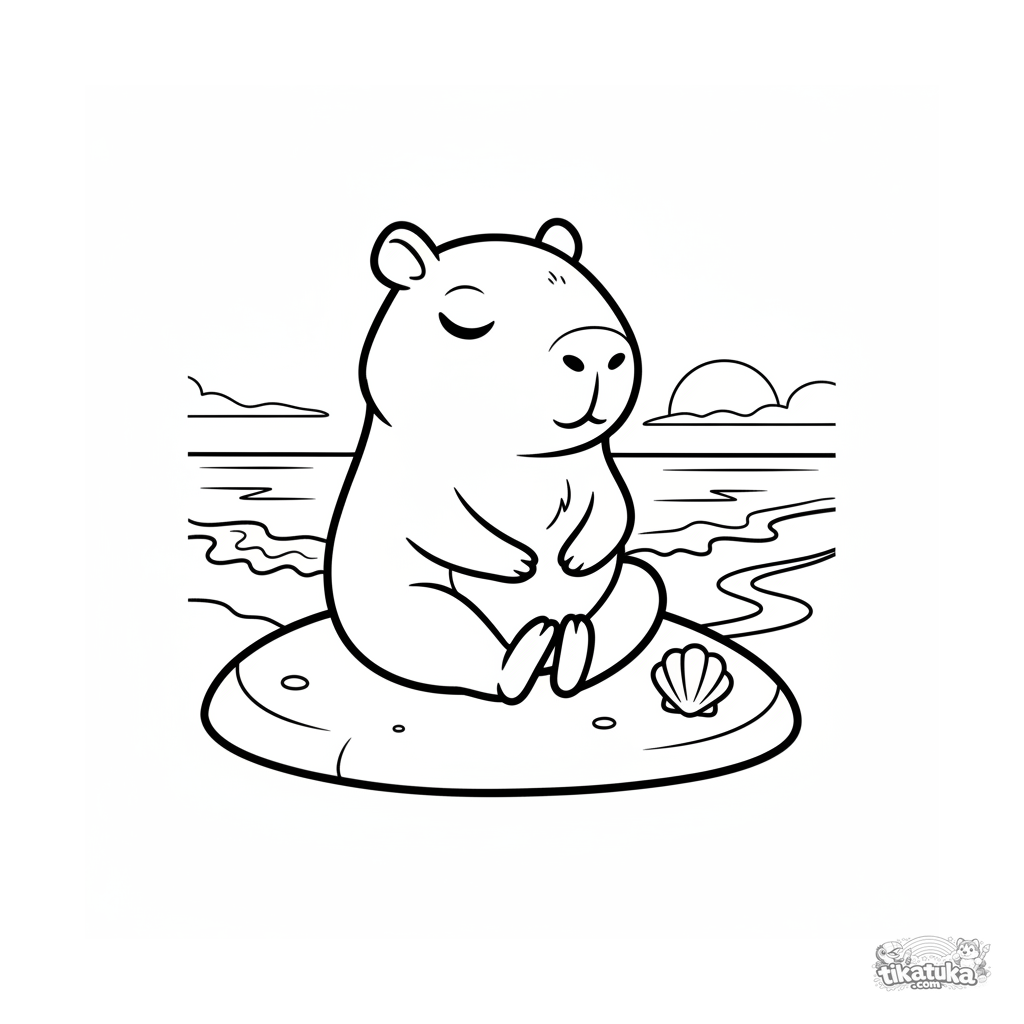 Раскраска для детей 4-6 лет: милый капибара медитирует на камне у моря на закате. Простые формы, сцена спокойствия с ракушкой и волнами.