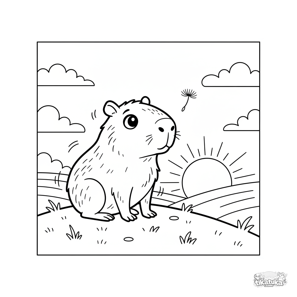 Раскраска с капибарой, наблюдающей за закатом на холме. Сцена спокойствия и размышлений для детей 7-9 лет. Полное тело животного, широкие поля.