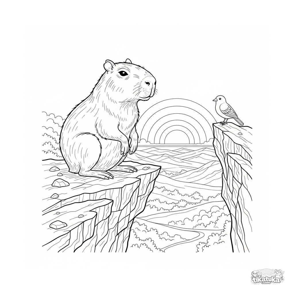 Раскраска с капибарой, созерцающей закат на скале. Для детей 10-12 лет. Детализированная сцена в реалистичном стиле, передающая философское спокойствие.