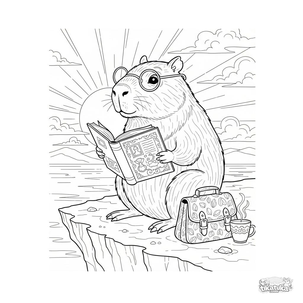 Детальная раскраска для детей 10-12 лет: капибара в очках читает книгу на краю утёса, наблюдая за закатом. Сцена мудрости и философского размышления.