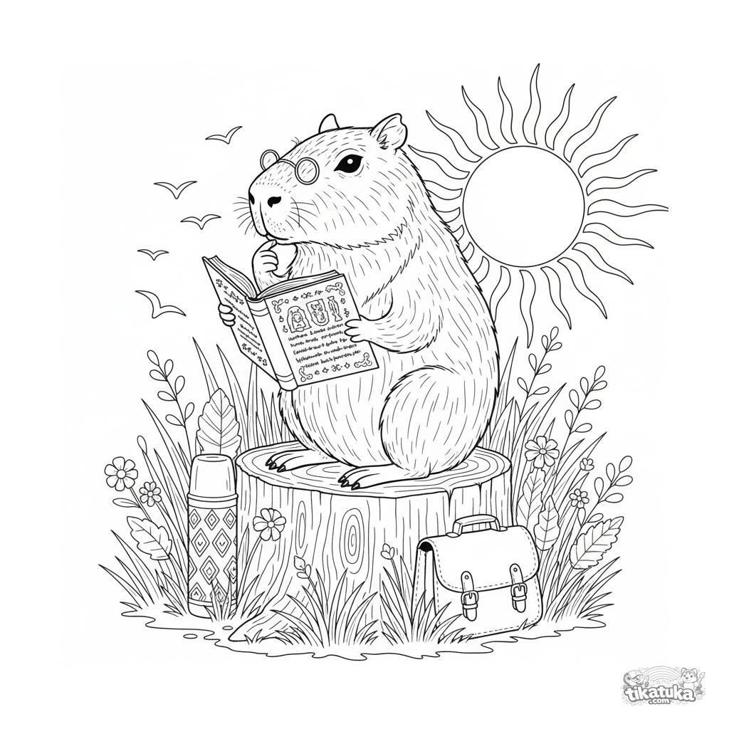 Детализированная раскраска для детей 10-12 лет: капибара в очках читает книгу на пеньке на закате. Сцена для любителей деталей, книг и спокойных вечеров.