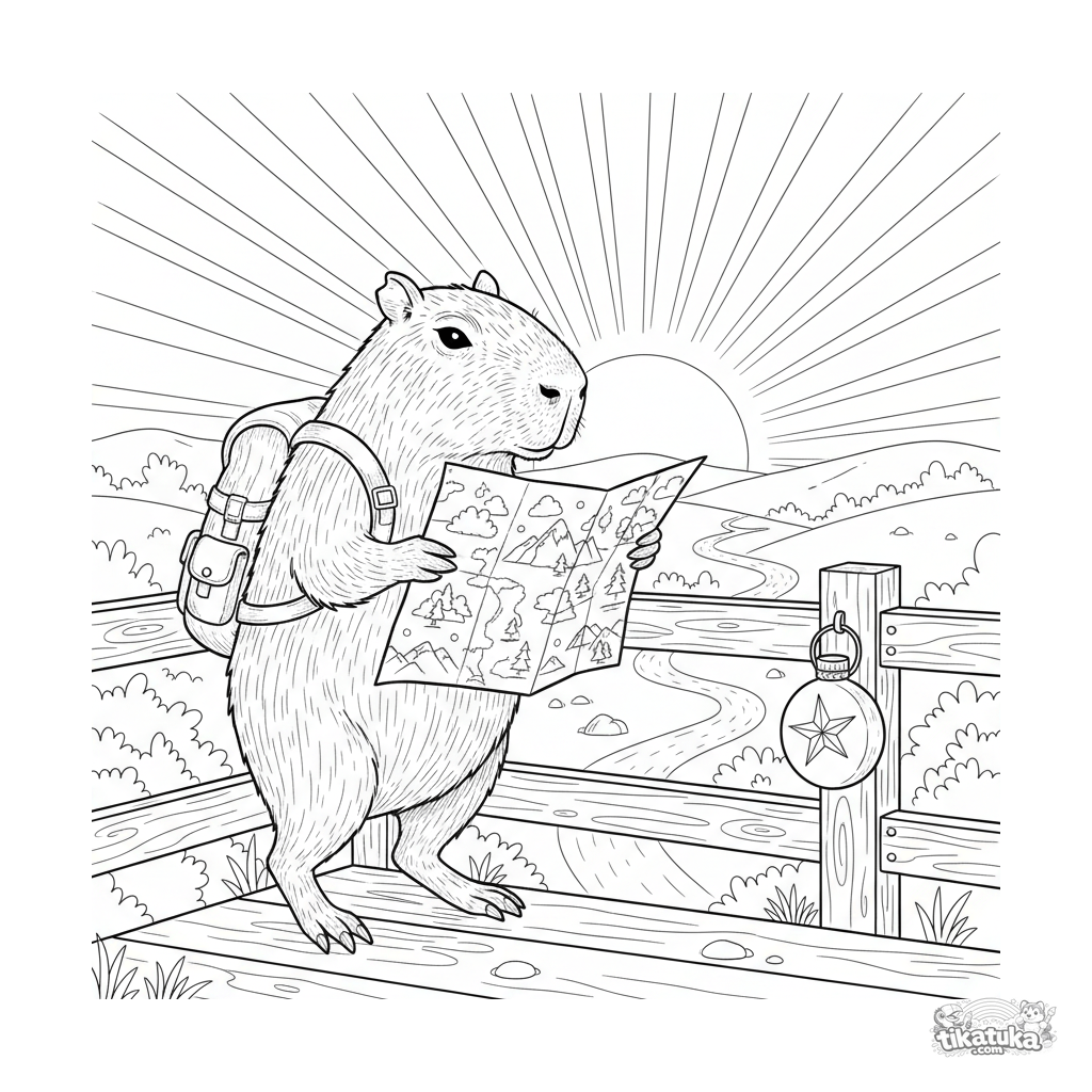 Детальная раскраска для детей 10-12 лет: капибара-путешественник с рюкзаком изучает карту на смотровой площадке на фоне заката. В научно-популярном стиле.