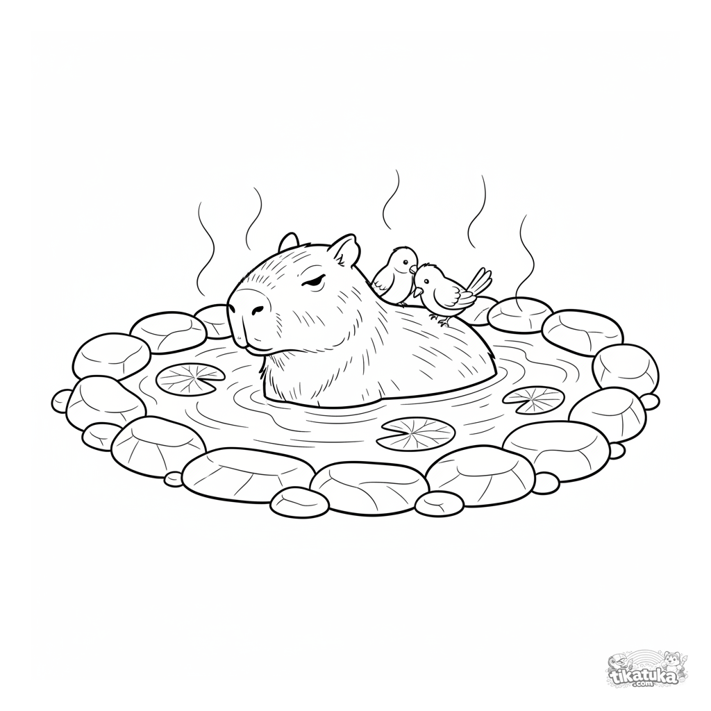 Раскраска для детей 4-6 лет: спокойная капибара наслаждается отдыхом в тёплом природном источнике, а на её спине сидят птички.