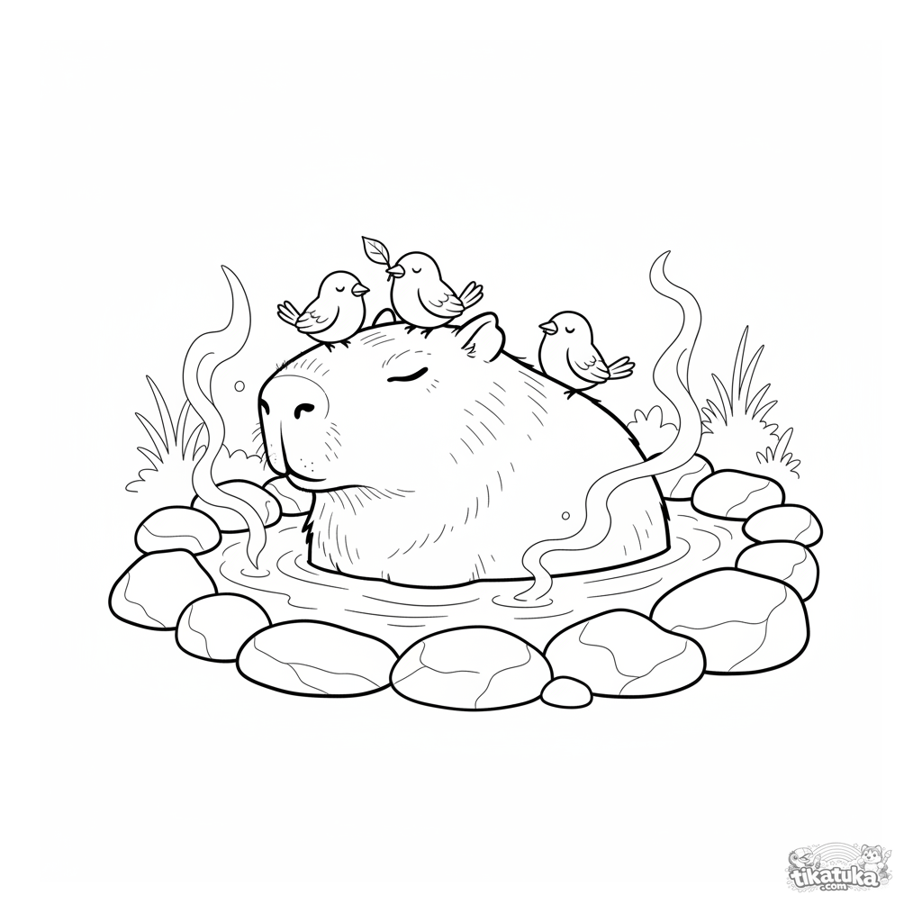 Детализированная раскраска для детей 7-12 лет: капибара расслабляется в тёплом природном источнике, на её спине и голове сидят маленькие птички.