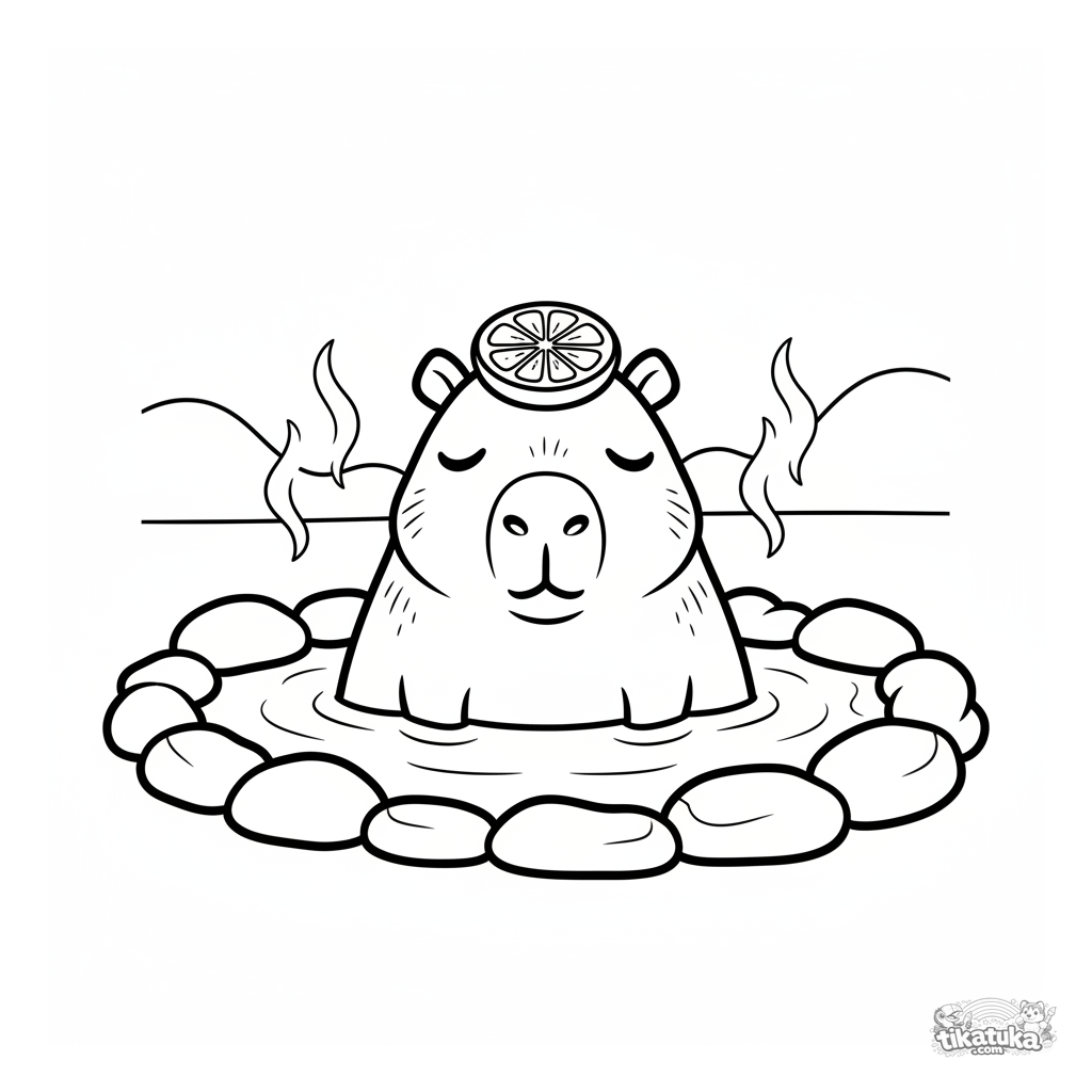 Простая раскраска для малышей 2-3 лет с очень расслабленной капибарой, которая принимает ванну в горячем источнике с долькой апельсина на голове. Большие формы.