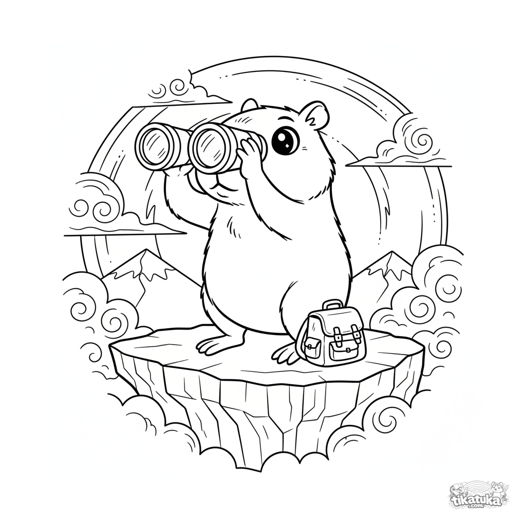 Раскраска для детей 4-6 лет: капибара-исследователь с биноклем стоит на скале, рассматривая закат. Динамичная и любознательная сцена.