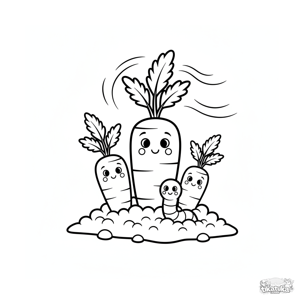 Простая раскраска для малышей 2-3 лет: семейка морковок в грядке. Крупные четкие формы, милые лица, мало деталей.