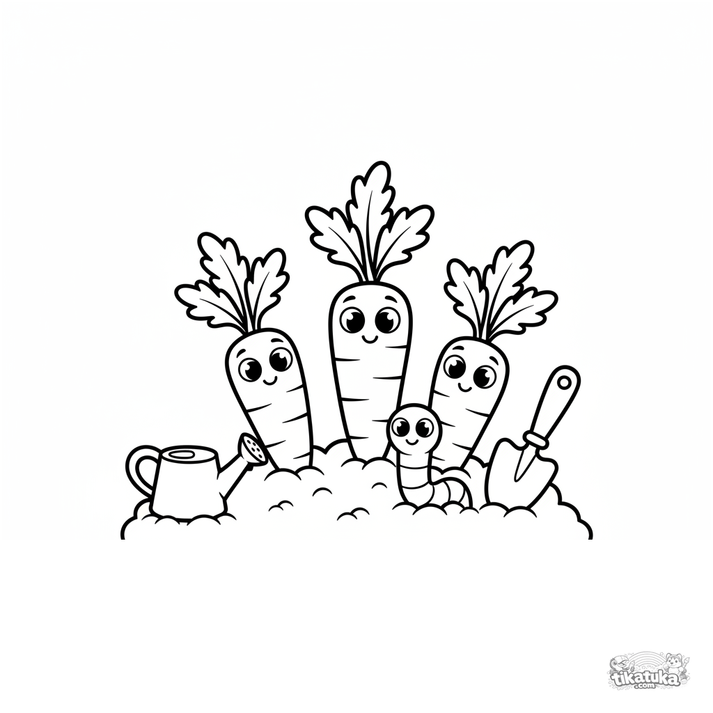 Простая раскраска для малышей 2-3 лет: три весёлые морковки растут в земле на грядке. Рядом червячок, лейка и совочек.