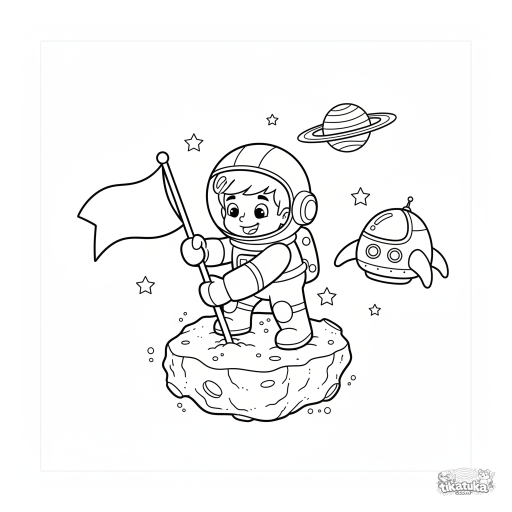 Раскраска с космонавтом в открытом космосе. Для детей 5-8 лет. Космонавт в скафандре устанавливает флаг на поверхности астероида, рядом припаркован космический корабль.