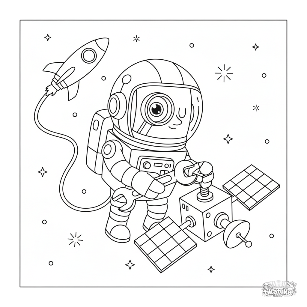 Раскраска с роботом-астронавтом, который чинит спутник в открытом космосе. Для детей 5-8 лет. Забавная и дружелюбная космическая сцена.