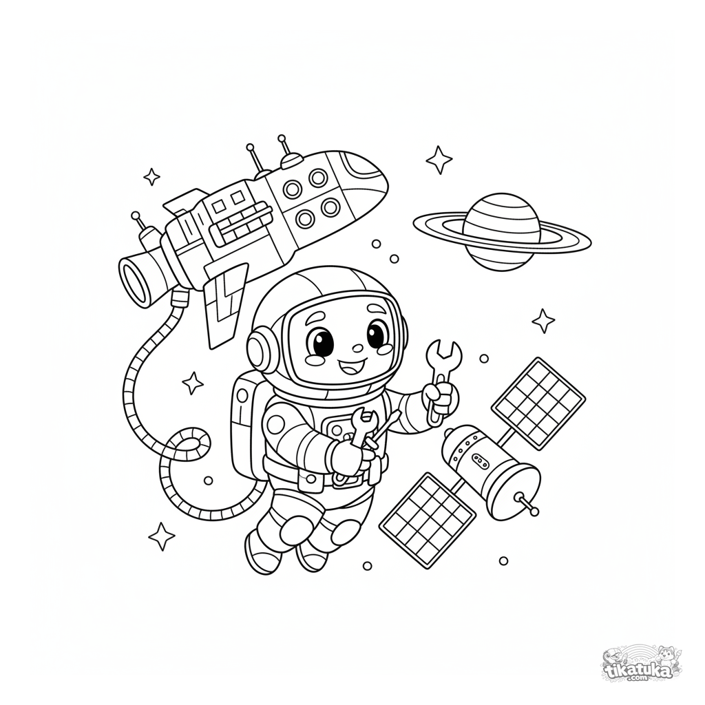 Раскраска с дружелюбным роботом-астронавтом, который чинит спутник в открытом космосе. Для детей 4-6 лет, с простым космическим фоном.
