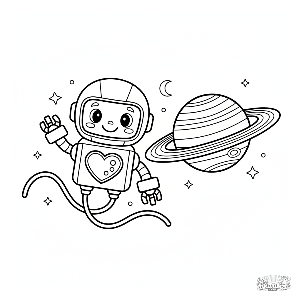 Простая раскраска с милым роботом-астронавтом, парящим в космосе рядом с планетой, имеющей кольца. Для малышей 2-5 лет. Крупные детали, толстые контуры.