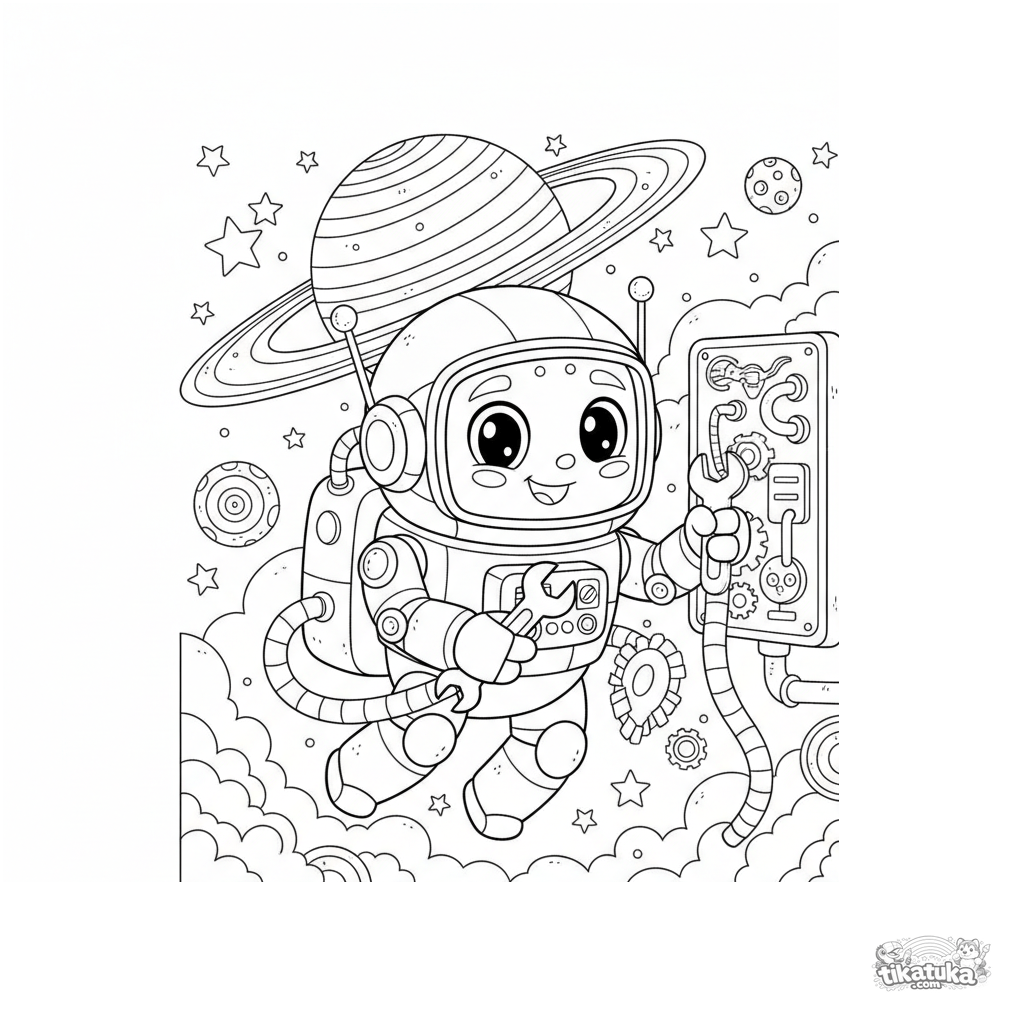 Раскраска с дружелюбным роботом-космонавтом, который ремонтирует что-то в открытом космосе у кольцевой планеты. Для детей 7-12 лет, с детализированным космическим фоном.