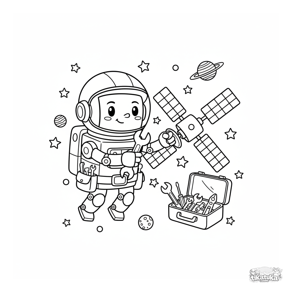 Раскраска с роботом-астронавтом, ремонтирующим спутник в космосе. Для детей 5-8 лет. Весёлая космическая сцена на белом фоне с планетами и звёздами.