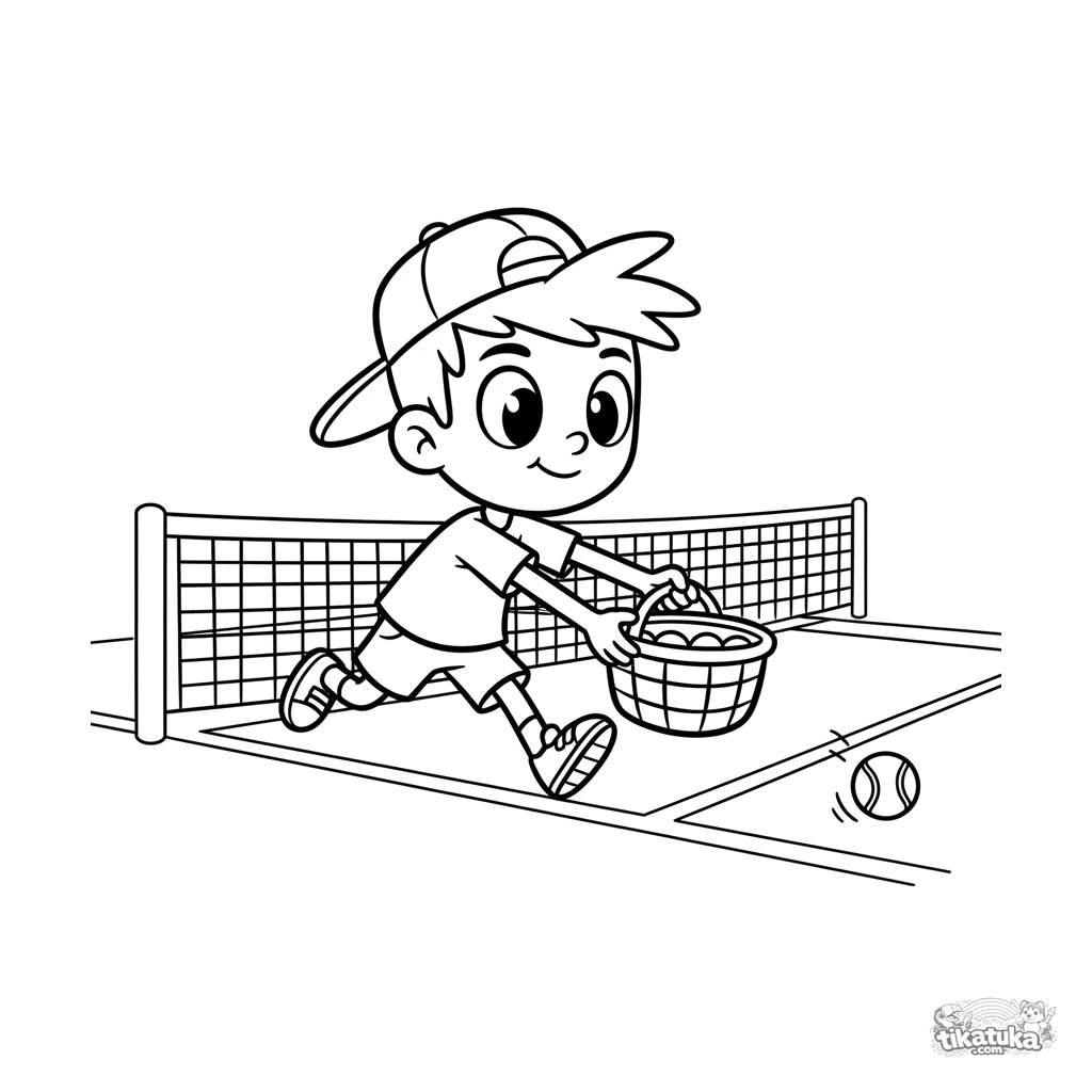 Раскраска для детей 7-9 лет: забавный бол-бой в мультяшном стиле 90-х гонится за мячом на теннисном корте. Динамичная поза, выразительные эмоции.