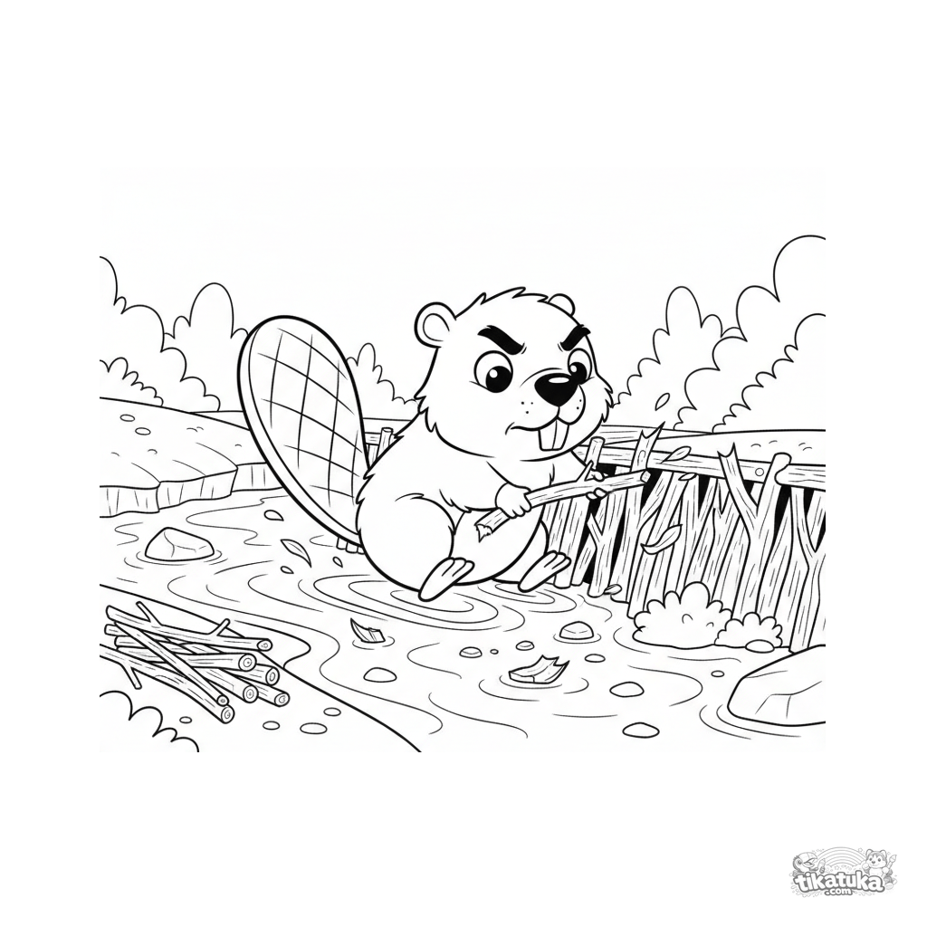 Раскраска для детей 7-9 лет: трудолюбивый бобр строит плотину из веток в ручье. Динамичная поза, понятное действие, умеренная детализация.