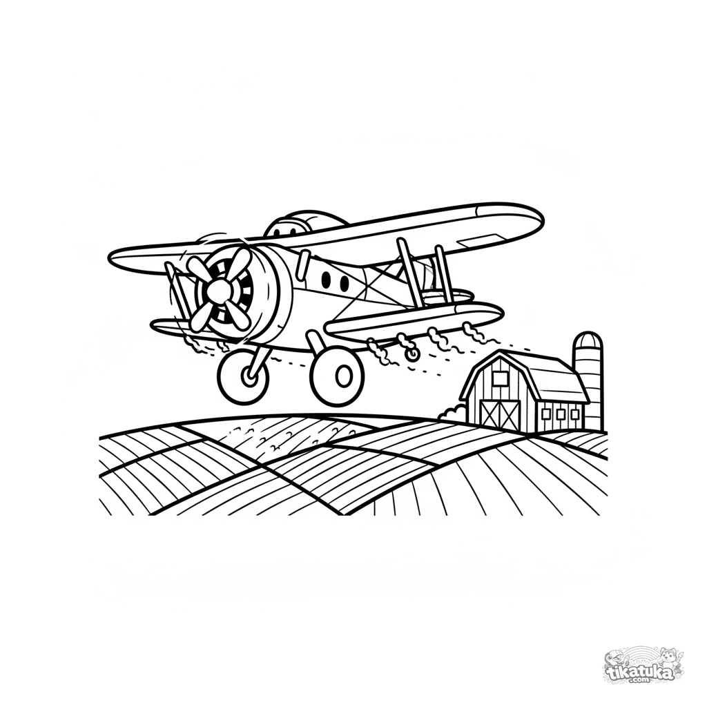 Раскраска с мультяшным самолетом-опылителем, летящим низко над фермерскими полями. Для детей 7-9 лет. Яркий дизайн, узнаваемая сельская сцена.