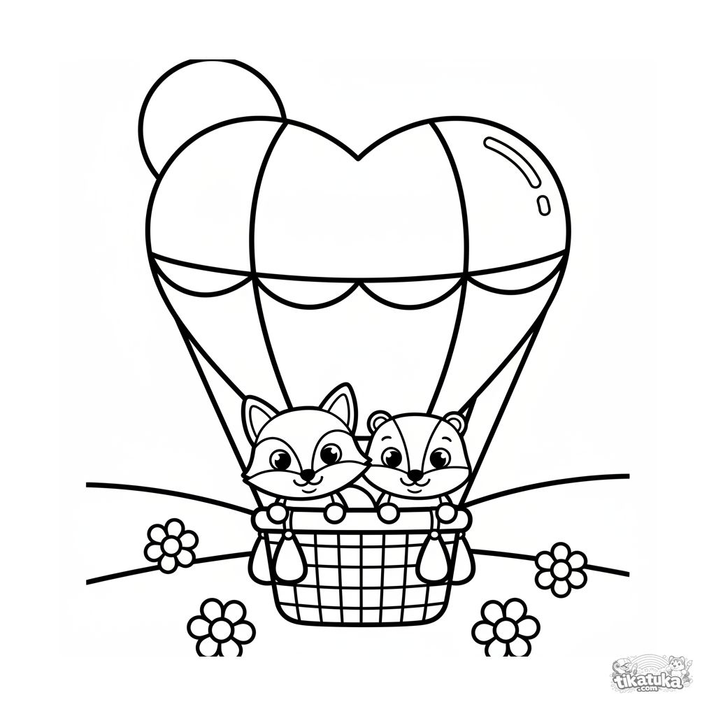 Простая раскраска для малышей: воздушный шар в форме сердца летит над цветущим лугом на закате. В корзине — улыбающиеся лиса и барсук. Крупные формы, толстые контуры.