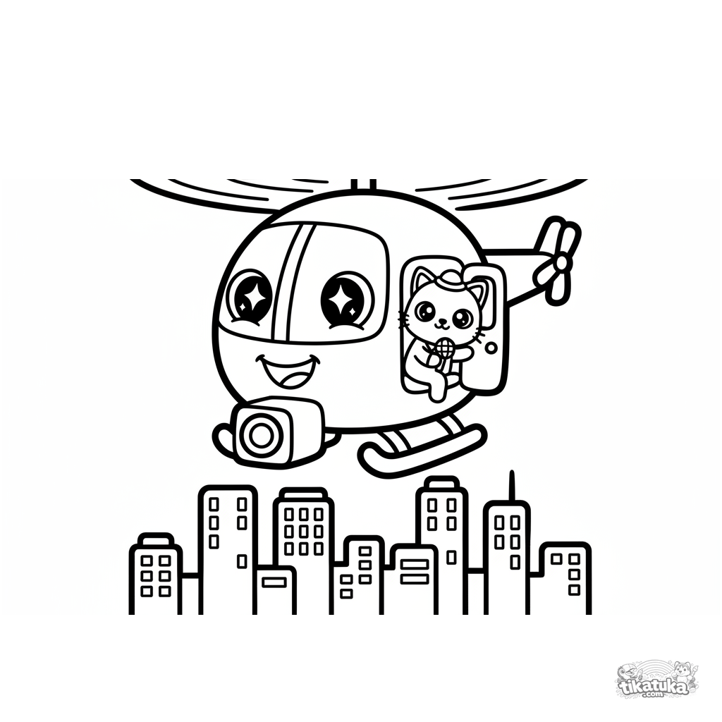 Раскраска для малышей 2-3 лет: весёлый мультяшный вертолёт завис над городом. Очень простые, крупные формы, толстые контуры, мало деталей.
