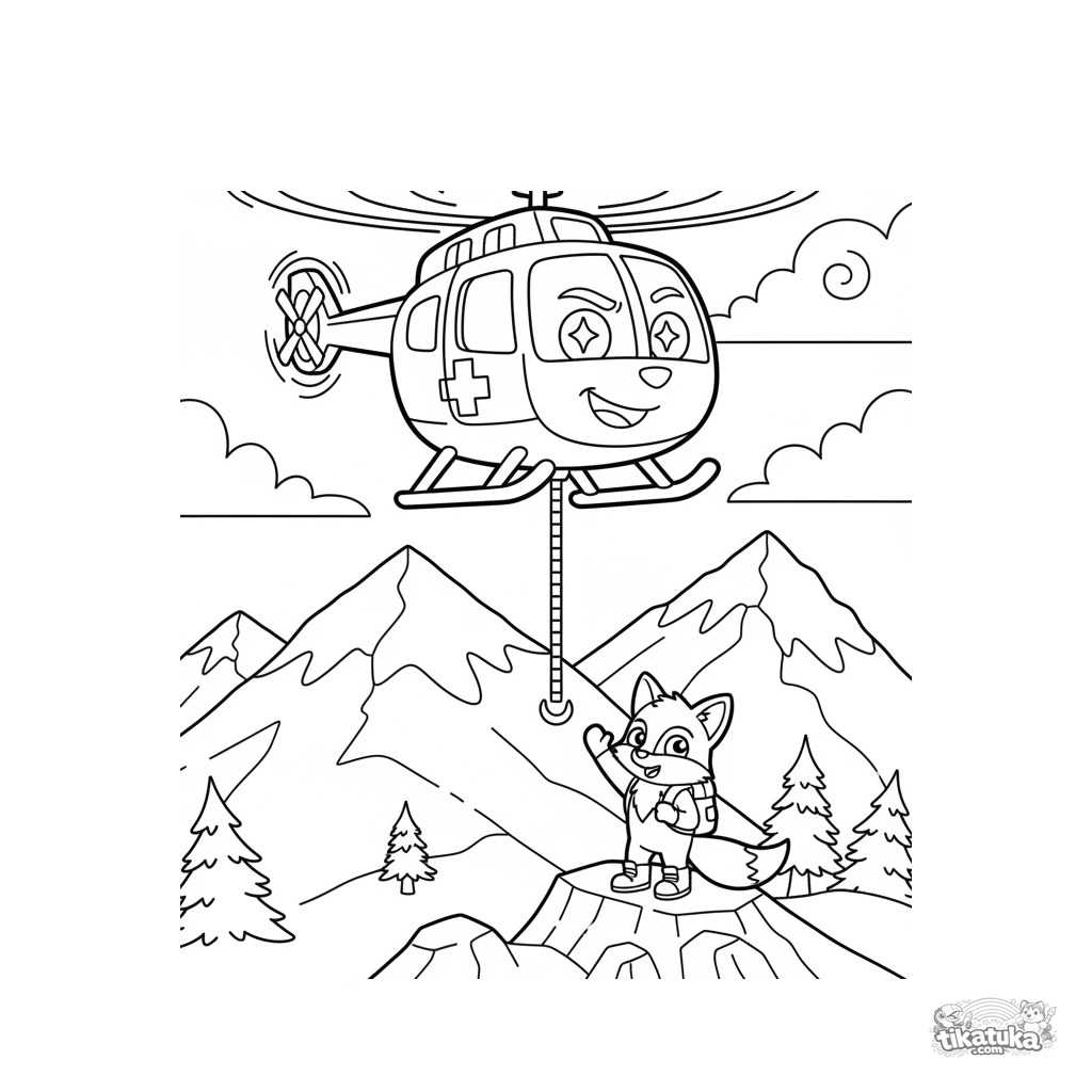 Раскраска для детей 7-9 лет: вертолет спасательной службы завис над заснеженной горой, чтобы помочь путешественнику. Динамичная сцена с четкими контурами.
