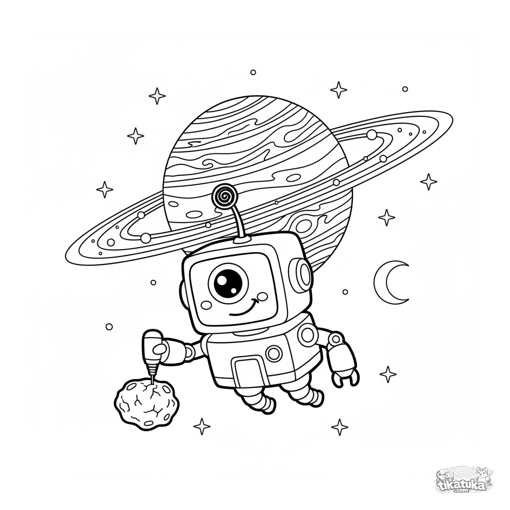 Раскраска с дружелюбным роботом-зондом, исследующим кольцевую планету-гигант в космосе. Для детей 8-12 лет. Сложная и интересная космическая сцена.