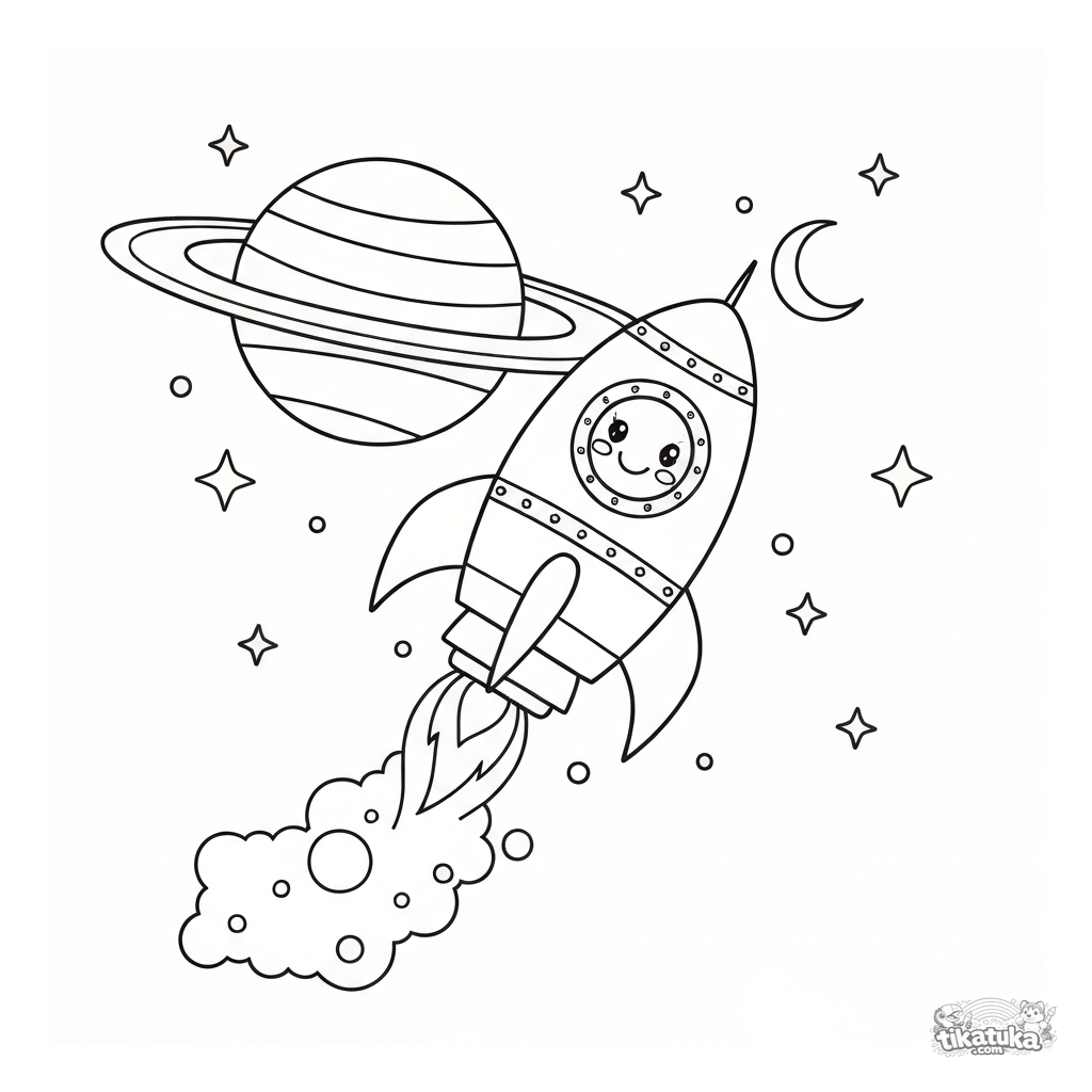 Раскраска с дружелюбной ракетой, летящей вокруг кольцевой планеты. Для детей 5-8 лет. Космическая сцена с планетами и звездами.