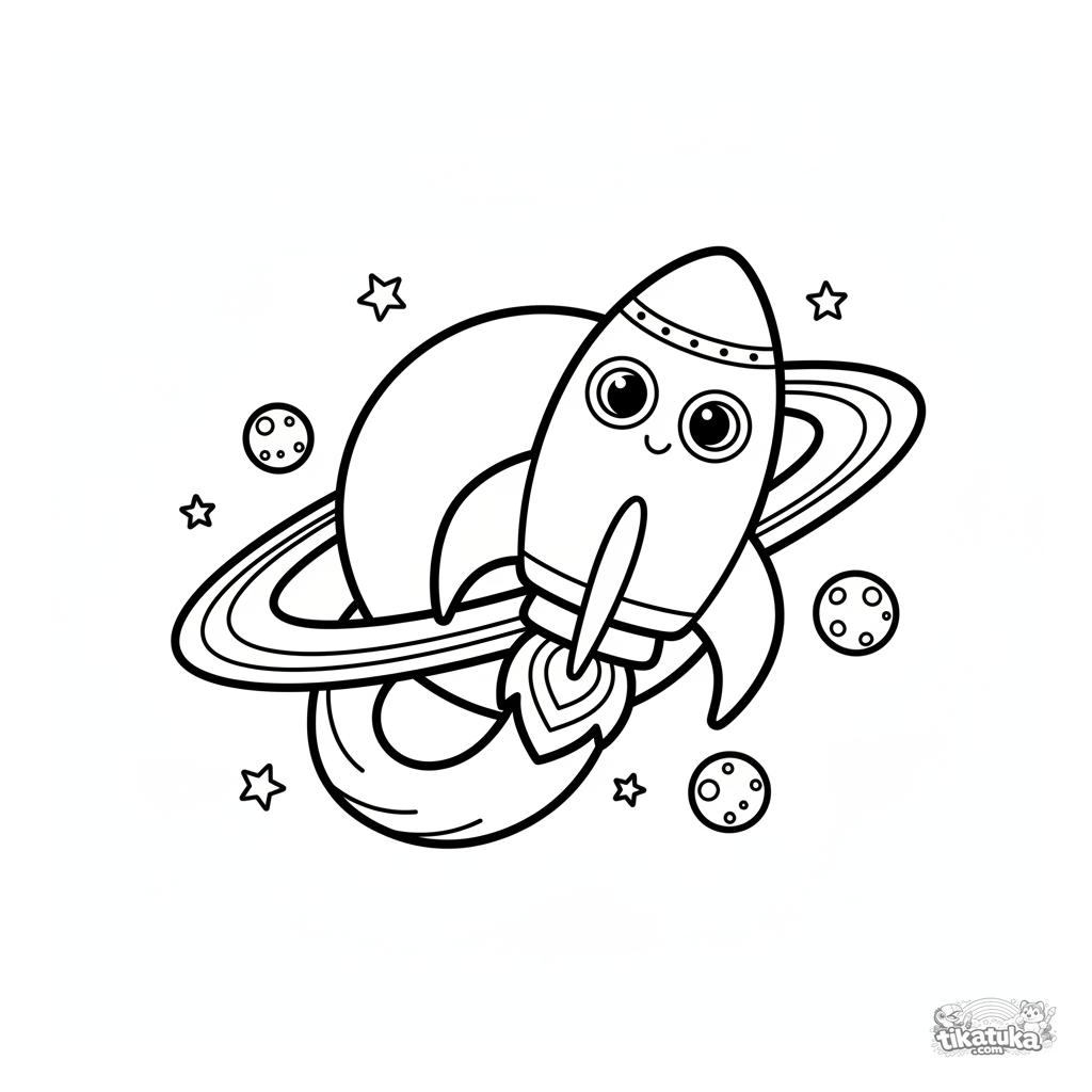 Раскраска для малышей 2-3 года: весёлая ракета с глазками-иллюминаторами летит вокруг большой планеты с кольцами. Максимально простые контуры, крупные детали.