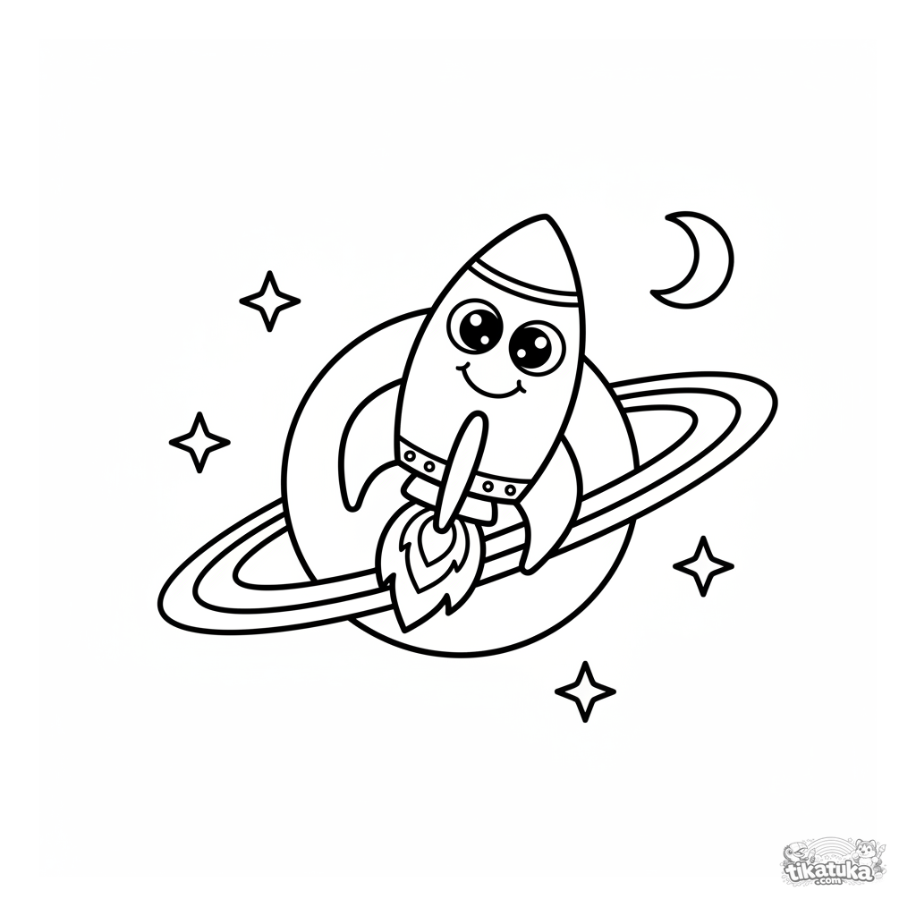 Простая раскраска: ракета летает вокруг планеты с кольцами в космосе. Для детей 4-6 лет. Крупные простые формы, широкие белые поля, дружелюбный дизайн.