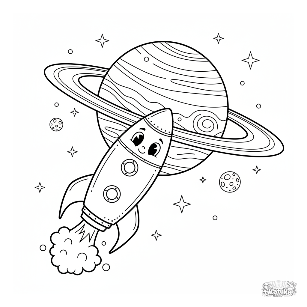 Раскраска космической ракеты, летящей вокруг планеты с кольцами. Для детей 5-8 лет. Стилизованная сцена с улыбающейся ракетой, лунами и звездами.