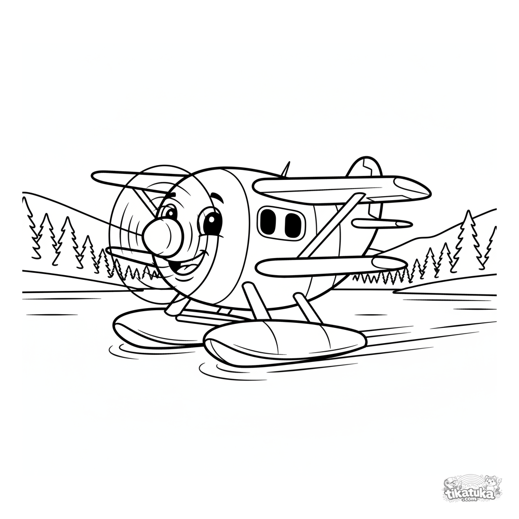 Простая раскраска с милым гидросамолетом на озере для малышей 2-3 лет. Крупные формы, у самолета улыбающаяся мордочка, четкие контуры.