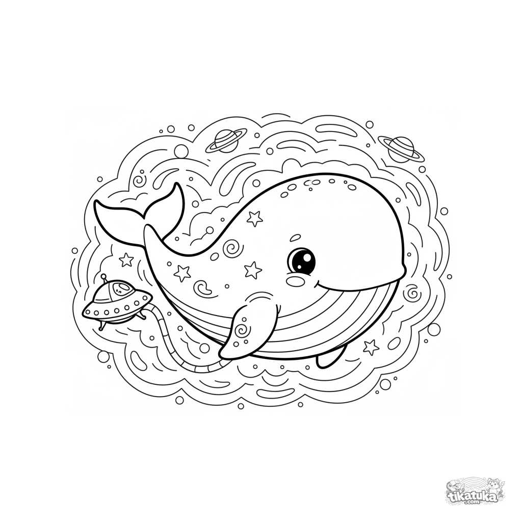 Раскраска с добрым мультяшным космическим китом, который плывёт через красочную туманность. Для детей 3-6 лет. Простые и волшебные космические формы.