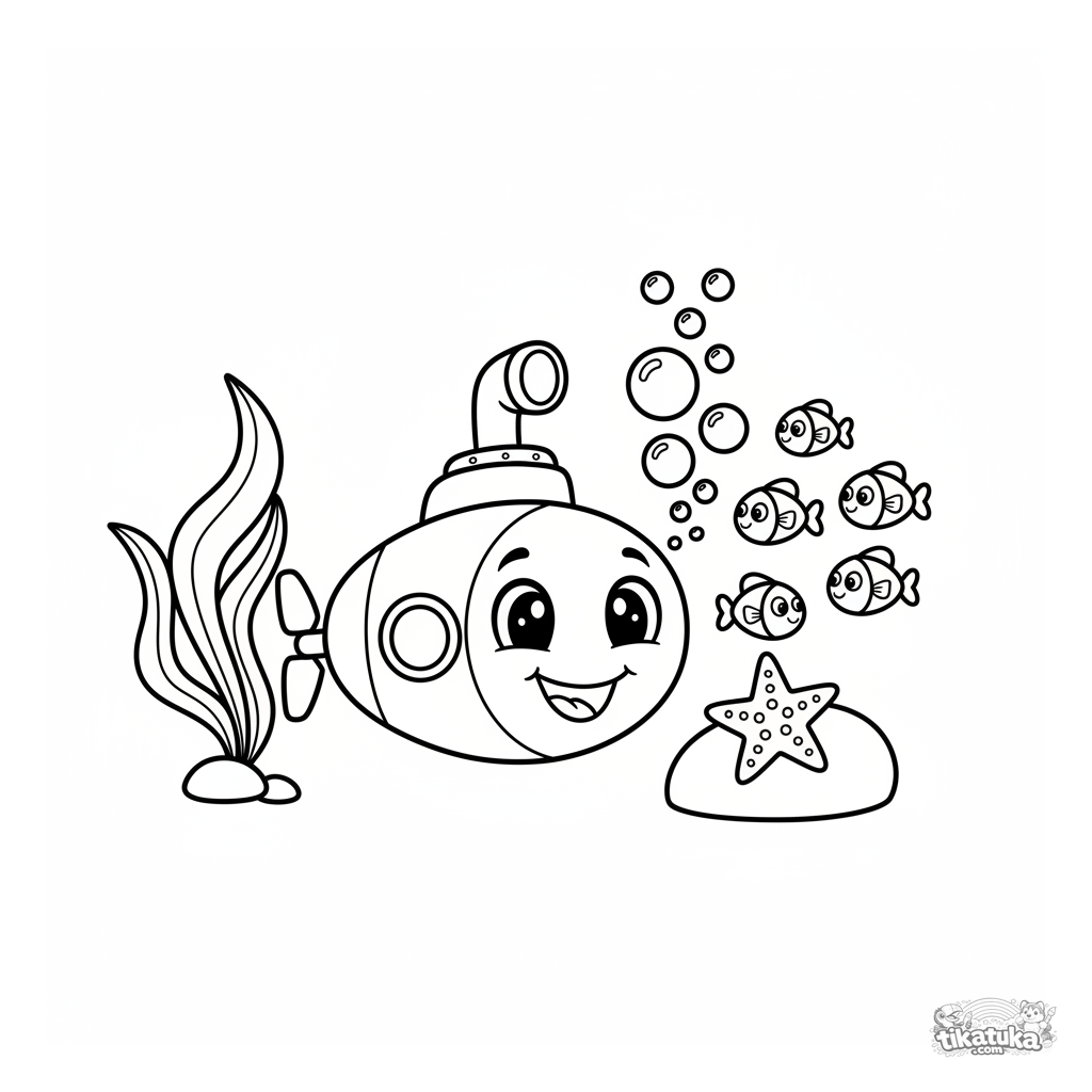 Раскраска для малышей: весёлая подводная лодка с лицом пускает пузыри среди кораллов и рыбок. Простые формы для возраста 2-3 года.