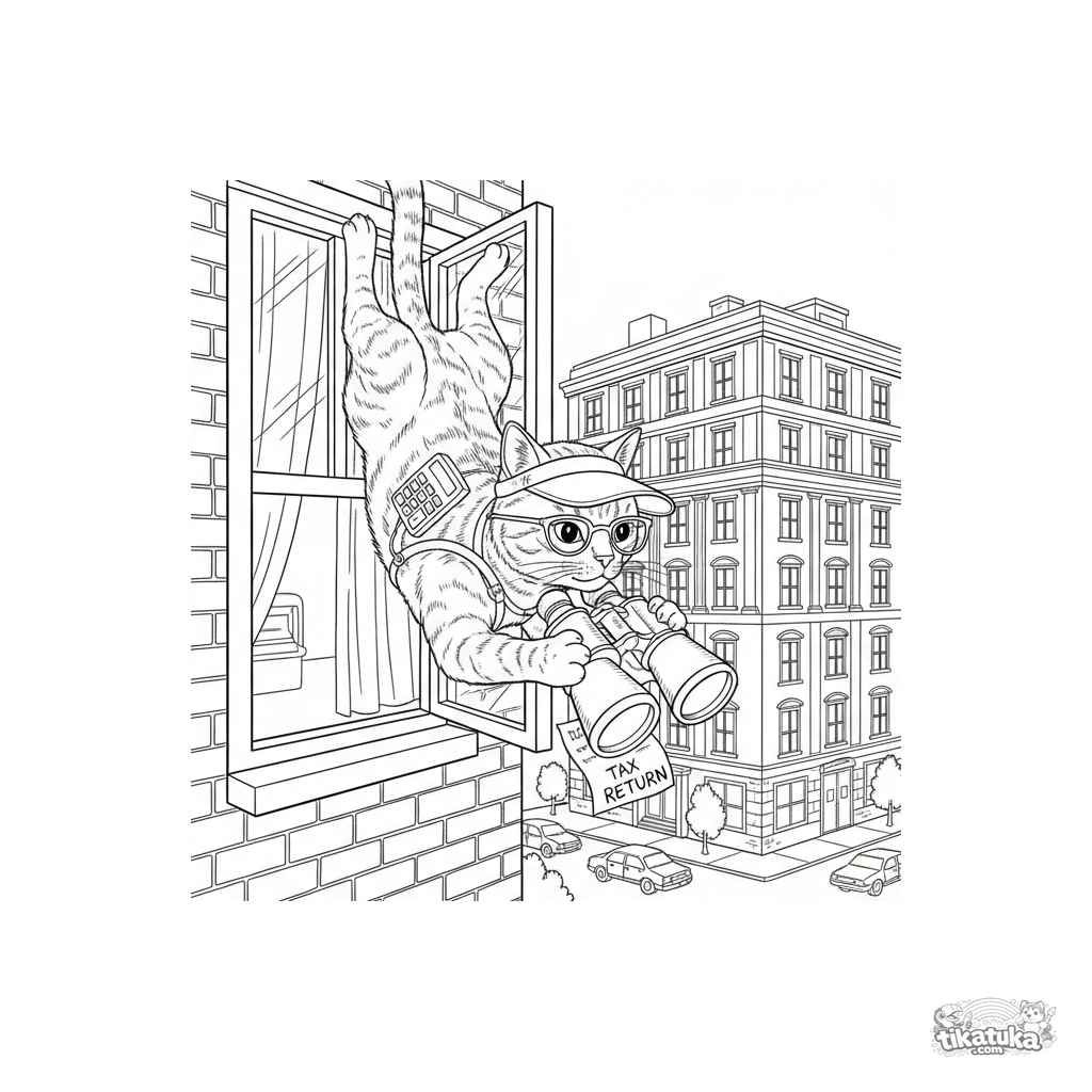 Раскраска для детей постарше: кот-бухгалтер в очках и с калькулятором высматривает банк в бинокль из окна. Детализированный смешной мем про финансы и зарплату.