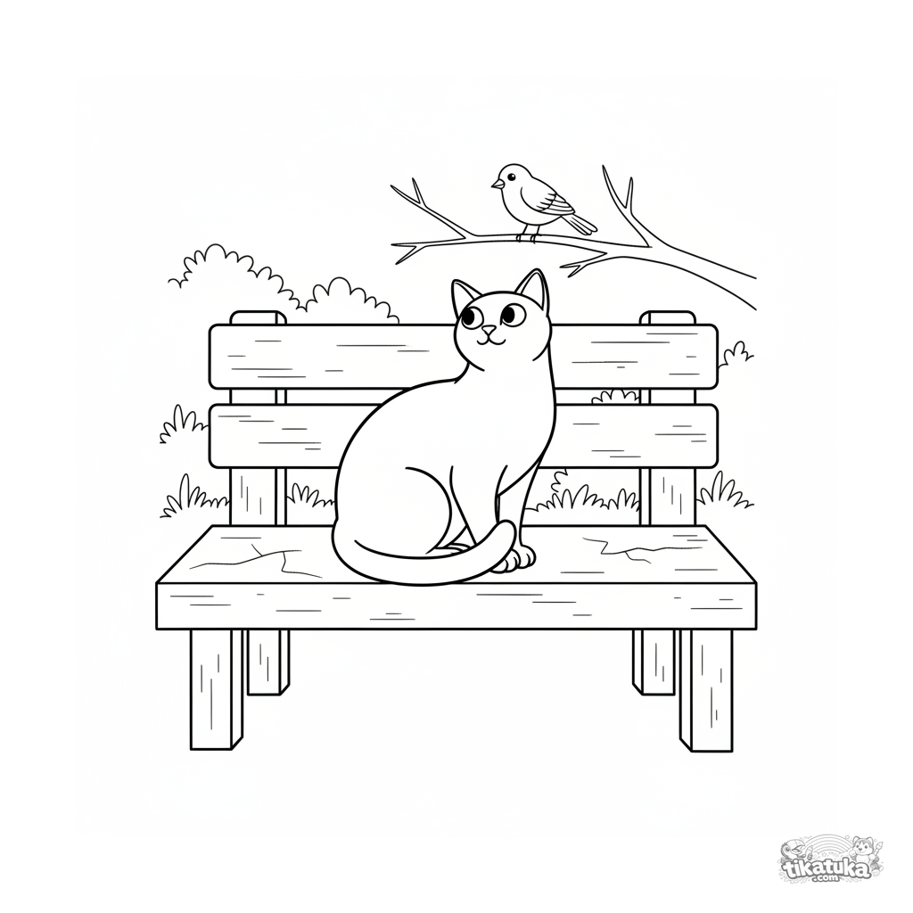 Раскраска для детей 7-9 лет: полосатый кот в естественной позе наблюдает за птицей, сидя на бетонной скамейке в парке. Реалистичный стиль.
